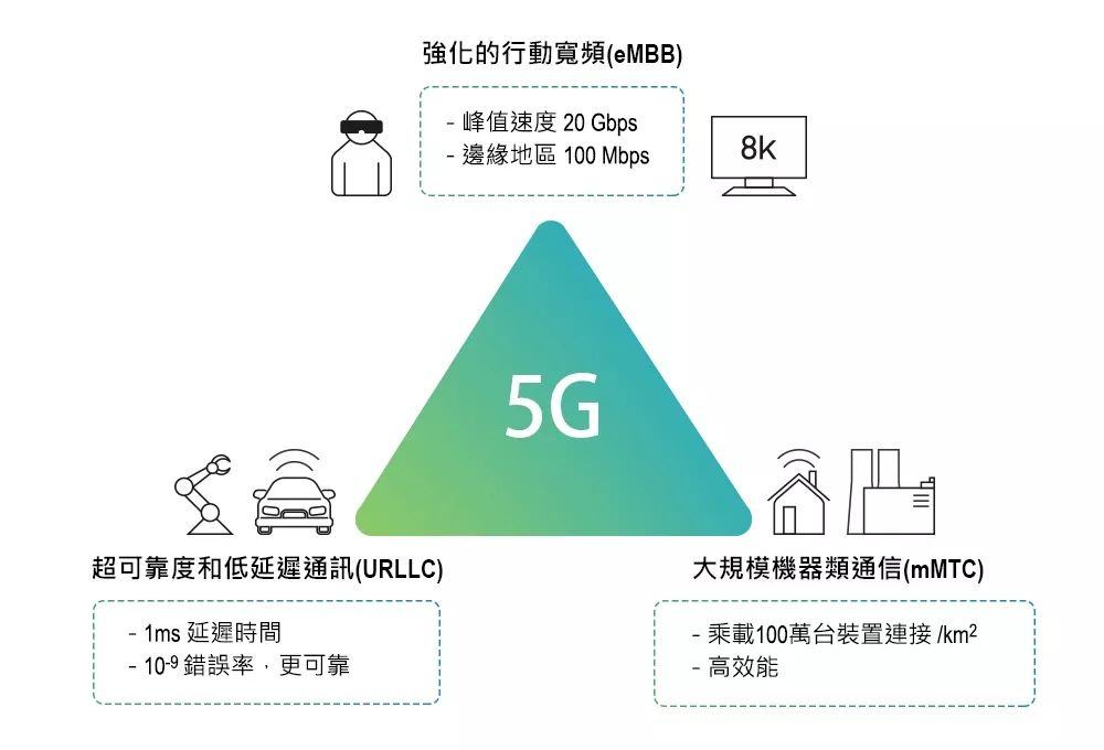 3GPP为5G定义了eMBB(增强移动宽带)、URLLC(低时延高可靠)、mMTC(海量大连接)三大场景。具体来说,eMBB场景主要是速率的提升,未来5G标准要求单个5G基站至少能够支持20Gbps的下行速率以及10Gbps的上行速率,主要应对4K/8K超高清视频、VR/AR等大流量应用。URLLC是要求5G的时延必须低于1ms,才能应对无人驾驶、智能工厂等低时延应用。而mMTC场景是海量大连接,对应物联网等连接量较大应用。
