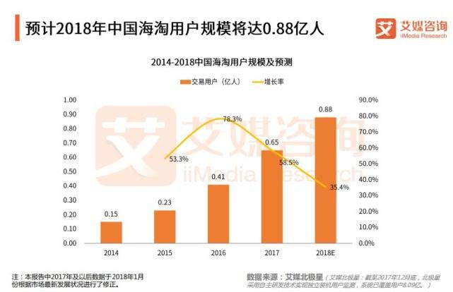 据iiMedia Research(艾媒咨询)发布《2018Q1中国跨境电商季度监测报告》显示:跨境电商市场交易规模(含零售及B2B),将从2017年的7.6万亿元人民币增至2018年的9.0万亿元(预计),海淘用户规模将从2017年的0.65亿增至2018年的0.88亿人。