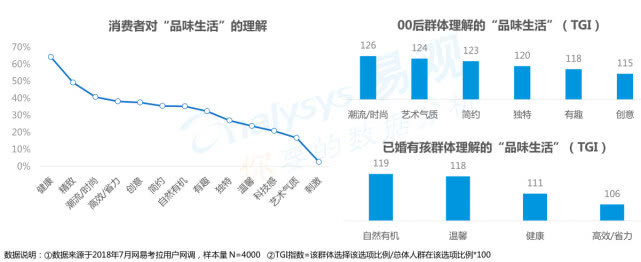 而在品质标准的共通上,能够看到的是,虽然更为年轻的00后群体,对于“品味生活”的理解,集中在潮流/时尚、艺术气质、独特、有趣、创意等个性表达上,而已婚有孩群体,对于“品味生活”的需求,则更倾向于家庭的需求,自然有机、温馨、健康和高效/省力成为他们的首选。但他们对于产品的健康、精致却有着一致性的追求,成为了消费者对于“品质”追求的共通标准。