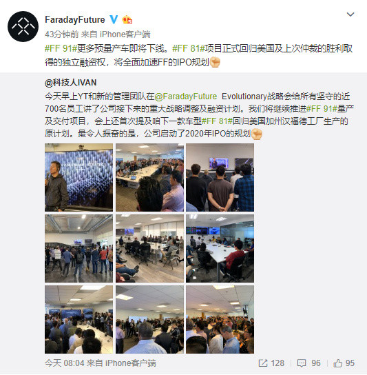 FF(法拉第未来)官方微博称,FF 91更多预量产车即将下线, FF 81项目正式回归美国及上次仲裁的胜利取得的独立融资权,将全面加速FF的IPO规划。