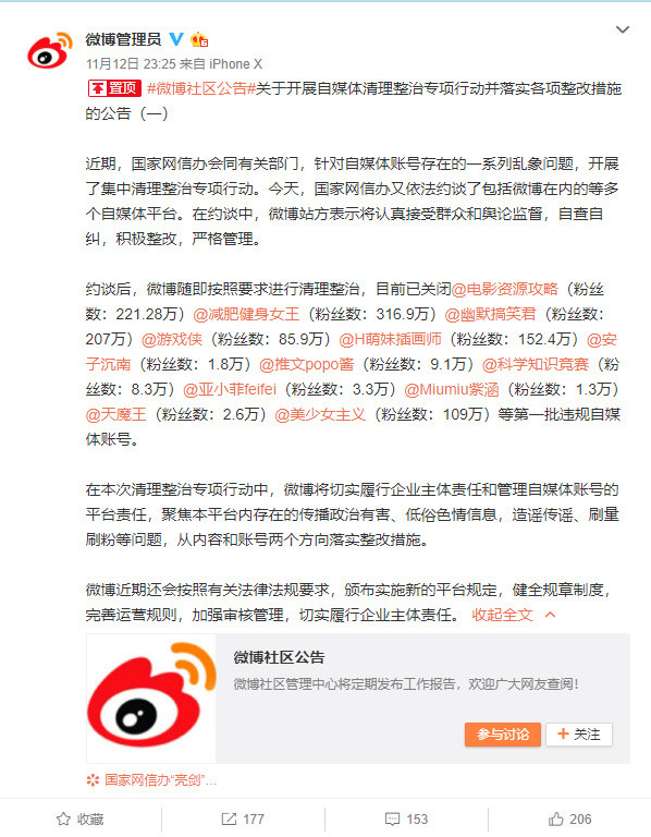 微博回应自媒体整治:自查自纠,积极整改