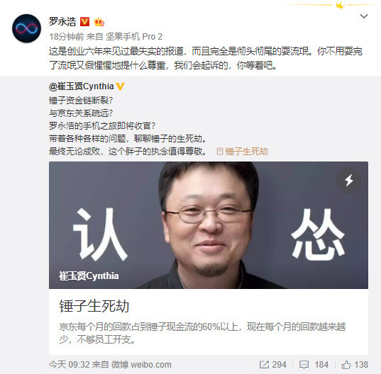 针对此前媒体报道文章《锤子生死劫》中指出的锤子公司启动裁员,并只剩40%员工,罗永浩发布微博称:“这是创业六年来见过最失实的报道”,并表示“会起诉的”。