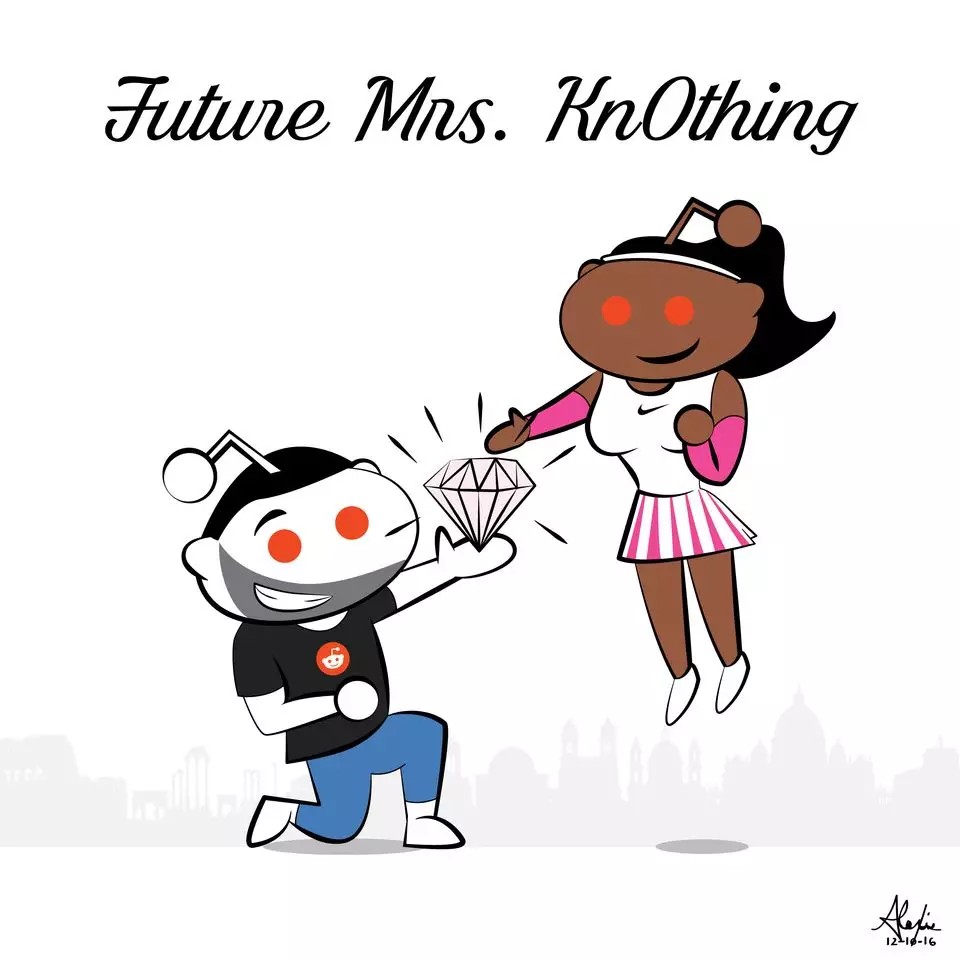 两人特别甜蜜,Alexis还为小威定制了一个Reddit上的专属logo。Alexis求婚成功后,小威在Reddit上自称“未来的Mrs. Kn0thing”。(Kn0thing是奥哈尼安在Reddit上的账号昵称)