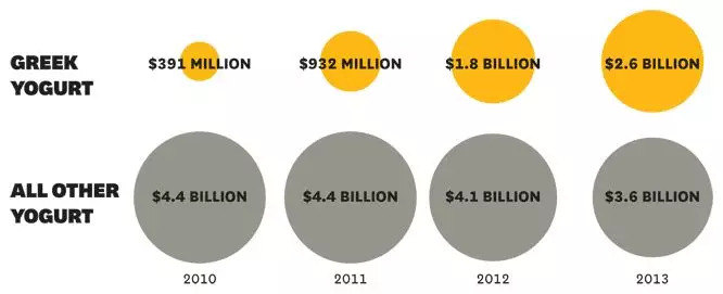 据《华尔街日报》的数据显示,2005年希腊酸奶的年销售额仅为6000万美元,但五年后,希腊酸奶就占到了美国每年68亿美元酸奶销售额的四分之一。
