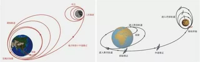 嫦娥一号的飞行轨道(右),嫦娥二号的飞行轨道(左)