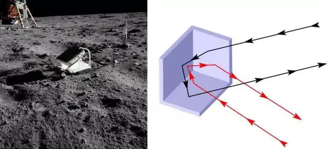 阿波罗11号放置在月面的激光角反射镜(左),角反射镜的原理:无论从什么角度入射,反射光线总是与入射光线平行。