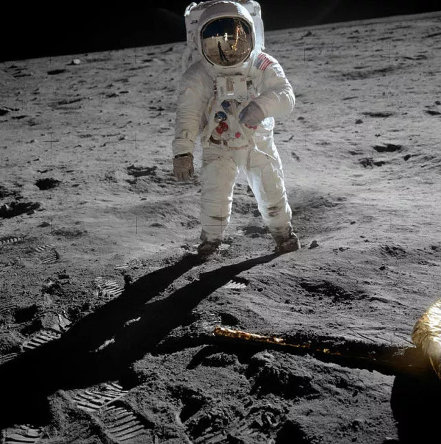 1969年,登月宇航员奥尔德林站在月面上,从头盔的反光中可见另一位宇航员,正是登月第一人阿姆斯特朗。