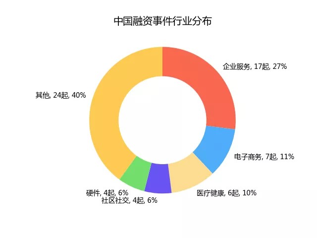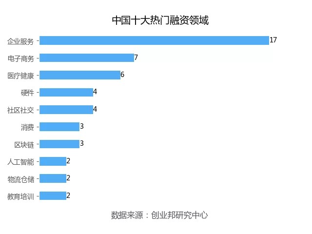 本周披露融资事件涉及22个行业领域,其中融资案例数最多的五大行业分别是:企业服务17起、电子商务7起、医疗健康6起、社区社交4起、硬件4起。