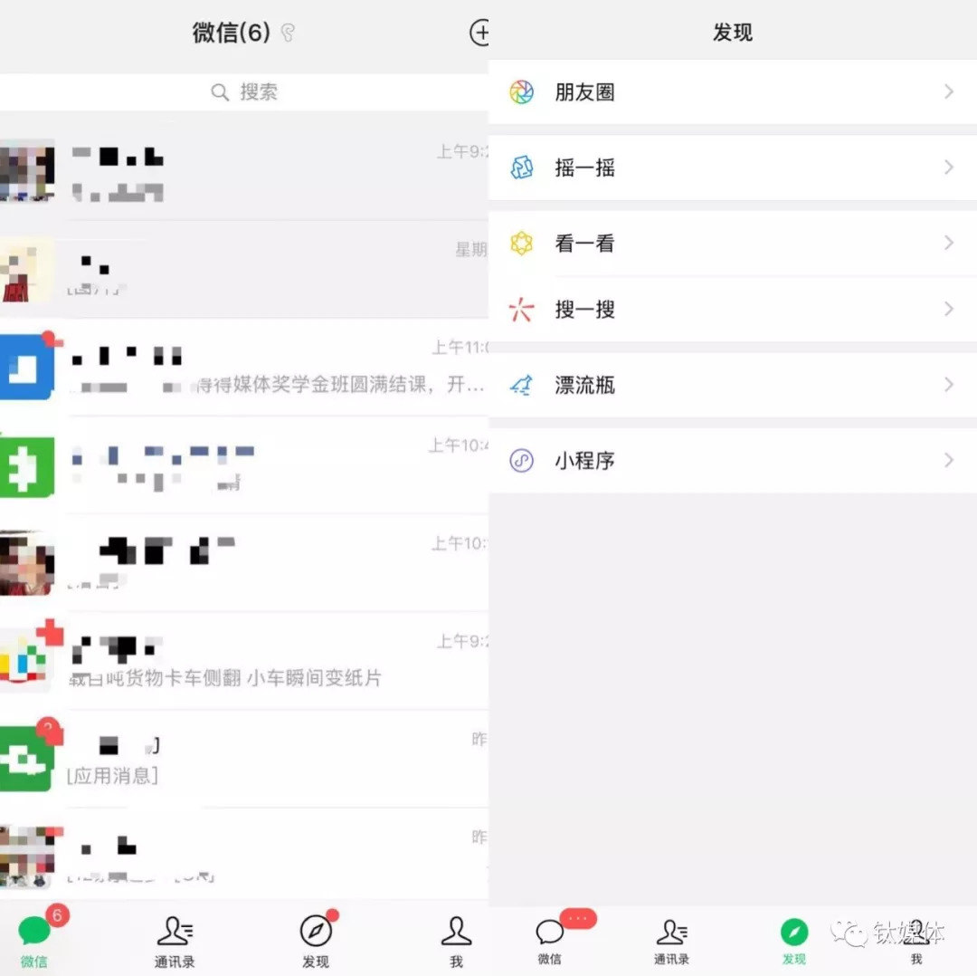 微信图标由深绿转为浅绿,灰色状态栏的透明化,发现页图标的“空心化”,聊天列表边框的淡化,无一不在降低自身的“存在感”,用户只需在“白纸”上挥洒社交印迹,而可以完全忽略掉白纸本身。