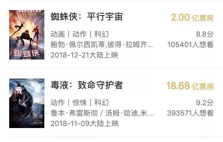 12月21日,索尼影业漫改动画电影《蜘蛛侠:平行宇宙》(以下简称《平行宇宙》)在国内上映,其预告片作为片尾彩蛋在《毒液》中出现,同一个时空里出现了六位截然不同的蜘蛛侠,虽然国内对彩蛋进行了删减,但是《毒液》掀起的蜘蛛侠宇宙概念已经为该片造势,《平行宇宙》猫眼想看人数超过10万,成为同档期内期待值最高的电影。