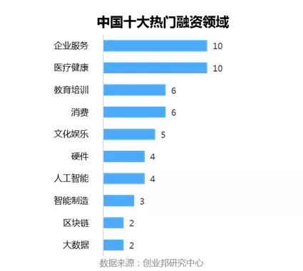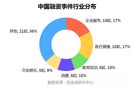 本周披露融资事件涉及15个行业领域,其中融资案例数最多的五大行业分别是:企业服务、医疗健康并列10起,教育培训、消费并列6起,文化娱乐5起。