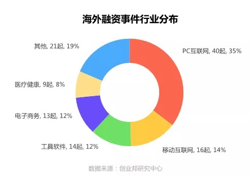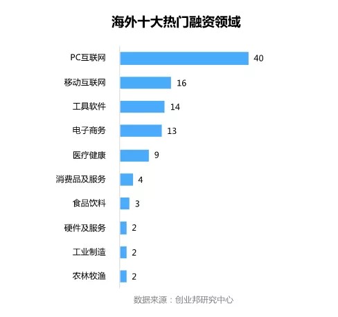 本周披露国外融资事件涉及15个行业领域,其中融资案例数最多的五大行业分别是PC互联网40起,移动互联网16起,工具软件14起,电子商务13起,医疗健康9起。