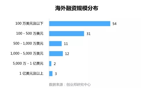本周国外融资事件的融资规模主要集中在100万美元及以下,共54起。融资额达1亿美元以上的案例有3起。
