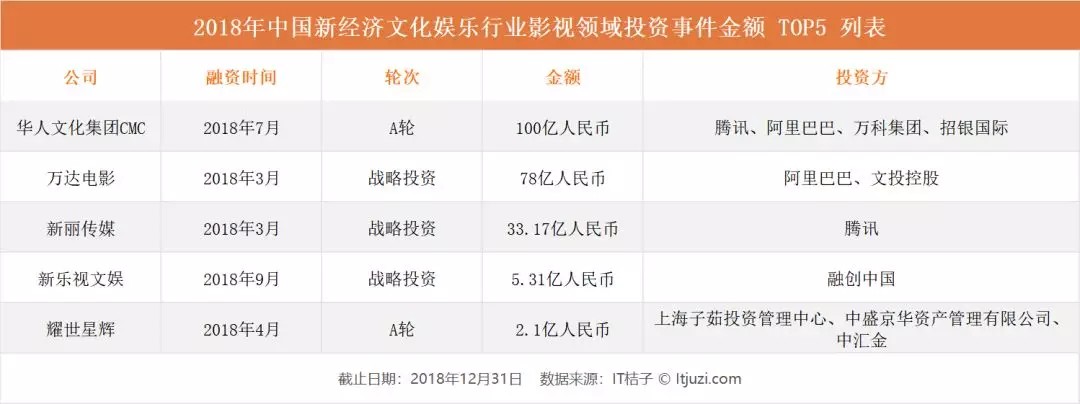 同时,可以看到 2018 年文化娱乐行业中,战略投资占比达到了 10%,其中腾讯、阿里等大公司参与了一部分战略投资事件。