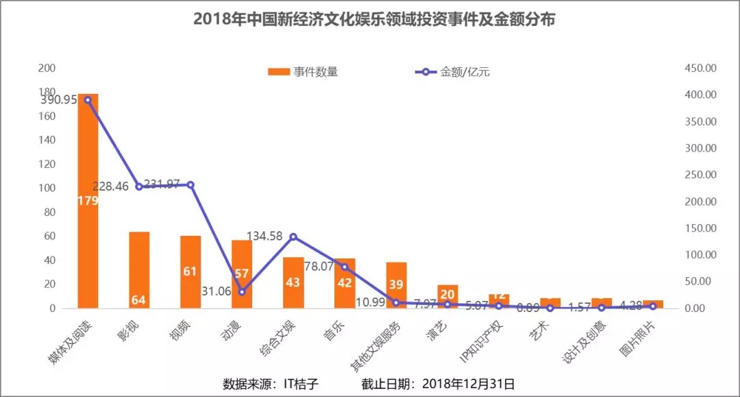 从 2018 年文化娱乐行业投资事件子行业分布来看,媒体及阅读领域出现事件数量和投资金额「双高」的局面。其中,投资事件数量出现高峰源于「区块链」风口,2018 年大量区块链相关媒体获得投资。IT 桔子数据显示,2018 年该领域共计发生 68 起投资事件,占媒体及阅读领域投资事件总和的 37%。