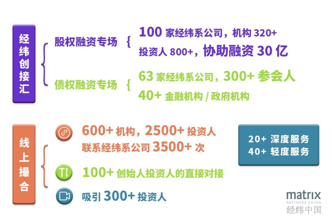 其背后所需要的,从张颖开始到每一个相关同事的思考、体系、消耗的资源以及坚持的决心无疑是庞大的——去年,我们的法务组完成了472次交易事件;财务 /数据组为经纬系公司提供了11400分钟的深度1对1全方位财税咨询;招聘组帮助经纬系公司招聘了500余人,其中包含超过200个总监及以上的核心职位;资本组协助被投公司高效接洽了近4000人次的投资人;医疗服务组处理了507起医疗需求;PR / MKT在经纬系内促成了167次资源合作,包括但不限于营销事件、市场增长,以及客户介绍……