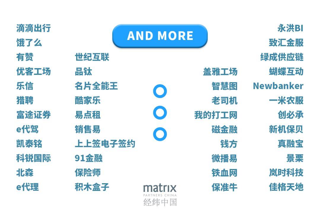 2018年,经纬系公司累计为超过400亿人次提供了服务 / 产品,在全球直接提供或者流转撮合了1.07亿个全职 / 兼职岗位。如滴滴出行、饿了么、小鹏汽车、车和家等公司,深入地改善了吃穿住用行等每个人都能受益的生活领域;又比如北森、盖雅工场、销售易、上上签电子签约等公司,为通用汽车、雅诗兰黛、百盛餐饮集团、星巴克、京东方、交通银行、工商银行、建设银行等国际知名大公司提供服务,通过对ToB平台的改造,提升了行业的整体效率。此外,找钢网、震坤行、行运全球汇等公司,通过产业互联网,提升了工业、3C、原材料等行业的整体效率。