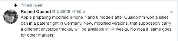 据外媒winfuture报道,苹果将更新iPhone 7和iPhone 8硬件,采用全新包络模块。据知名爆料人Roland Quandt 2月5日在其twitter上透露,为了绕过此前涉嫌侵犯高通专利的Qorvo芯片的节电专利,苹果已经计划在德国重修iPhone 7/8型号,新型号将采用新的包络追踪模块,预计4周内上架。