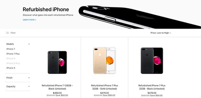 除了降价,雷锋网了解到,近日,苹果在美国官网推出了官方认证的翻新机销售页面,在这一页面在售的手机包括iPhone7、iPhone 7 Plus和iPhone X。