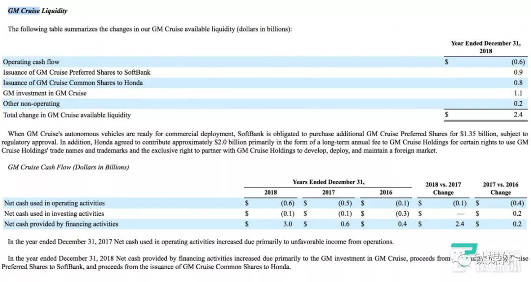 当然,自动驾驶业务所需的大量资金投入和产业链资源,也让通用在2018年开放了GM Cruise的股权结构,相继引入软银和本田两大重磅投资方。2018全年报中,通用汽车对这两起融资案进行了详细披露。