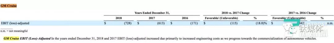 与电动汽车一样,自动驾驶同样是一项需要进行大量资金投入的创新业务。据年报信息,通用自动驾驶子公司GM Cruise从2016到2018年,每年亏损费用分别达到1.71亿美元、6.13亿美元和7.28亿美元(息税前),总亏损15.12亿美元。而结合通用公布的GM Cruise销售成本来看,这家公司尚无造血创收能力,所谓亏损即投入。