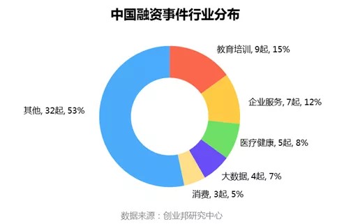 本周披露融资事件涉及22个行业领域,其中融资案例数最多的五大行业分别是:教育培训9起,企业服务7起,医疗健康5起,大数据4起,消费 3起。