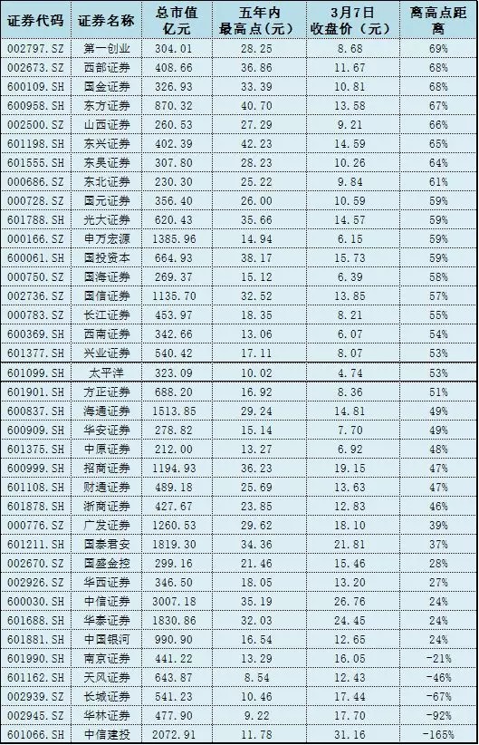 我们统计了券商板块每只股票3月7日的收盘价,以及近五年的最高点,计算出与最高点差距最远Top10分别是: