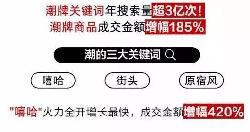 淘宝发布的2018年《中国男性消费报告》显示,2018年以“潮牌”为关键词的搜索量超三亿,潮牌商品成交金额增幅185%。