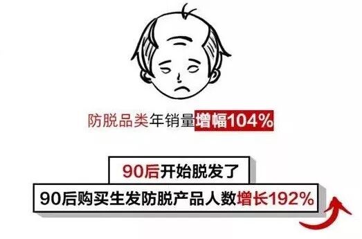 在如今,潮牌已经代替烟、酒、房、车成为年轻男孩们的社交货币,他们对自身的审美和生活态度都有了更高的标准和需求,“做这条街最靓仔”,也成了近年来许多90后、95后男孩们的个性标签。TOP 2:头发经济90后购买生发防脱人数增长了192%无论是多么精致的boy,都逃不了掉发脱发的命运。 2018年,中国整形美容协会副秘书长朱美如曾给出了一组数据,中国脱发人群越来越庞大。就拿雄性激素脱发来说,成年男性发病率高达20%,男性的脱发患者将近达到1.05亿,而女性发病率仅为5%,大约0.24亿人。 2018年,90后、95后小鲜肉们打响了一场轰轰烈烈的“防脱”保卫战,淘宝数据显示,90后中男性购买生发防脱人数增长了192%。