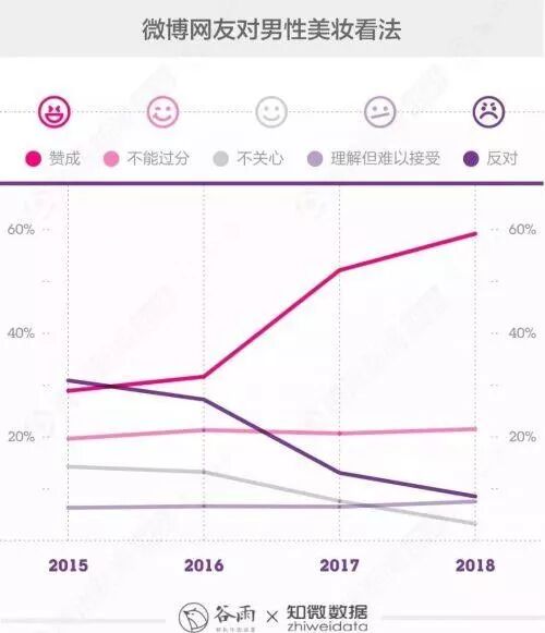 截止2018年10月还记得微博上这个敷着面膜爆红的小男孩吗?在如今,有些男生已经精致到令女生都自愧不如。根据2018年的一项数据,95后男生使用BB霜的比例接近20%,这就意味着,平均每5个95后男生中就有一个使用BB霜。在社交媒体上,针对男性护肤化妆的话题也在网上引起热议,男性颜值在近些年越来越受到大众关注。2018年有机构对微博用户看待“男性美妆”的态度进行了统计,结果显示,持反对看法的用户连年减少,截至目前已经降至10%以下,赞成者比重连年攀升,现在已经接近60%。