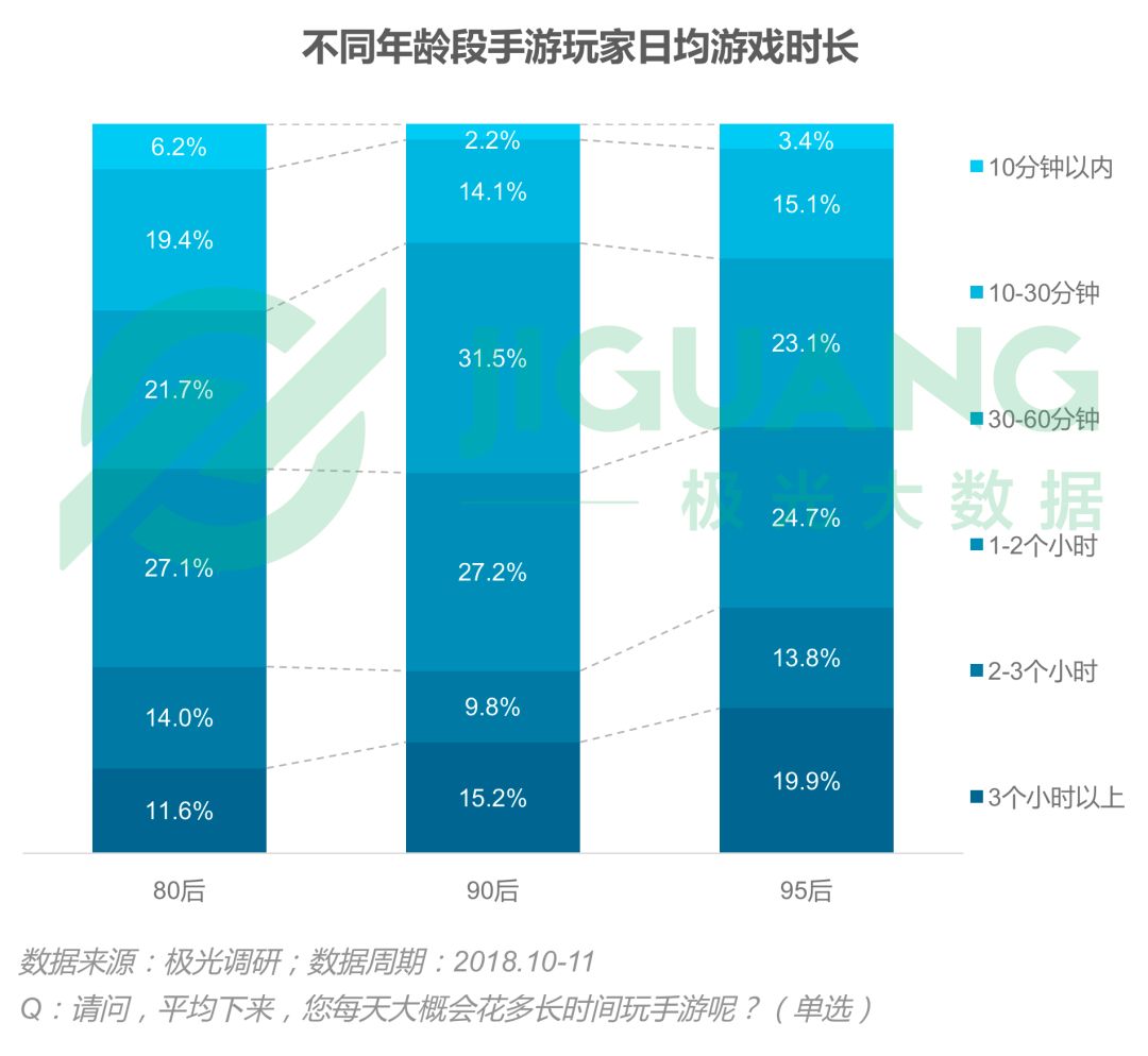TOP 1:游戏经济“烧”出个千亿市场不管是这两年农药、吃鸡等爆款手游的走红,还是B站、快手、虎牙、斗鱼等平台上大火的游戏直播,随着移动互联网对年轻人生活的进一步渗透,游戏在95后、00后尤其是男生的消费生活中有着越来越重要的地位。 根据中国音数协游戏工委《2018年中国游戏产业报告》的数据,2018 年国内游戏产业总收入为 2144.4 亿元,其中男性用户消费为 1654 亿元。 随着80后、90后逐渐踏入家庭和职场生活,空闲时间相对较多的95后、00后成为游戏市场的主力军。 95后多为大学生,闲暇时间相对较多,所以日均游戏时长明显高于80后和90后。根据极光大数据发布的《2018年年度手机游戏行业研究报告》显示,平时花2-3小时玩手游的95后玩家明显比90后和80后要多。