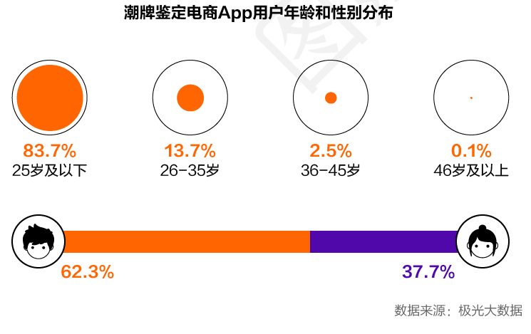 2017 年 Air Jordan 和时尚品牌 OFF-WHITE 的联名款球鞋,发售价为 1499 元,如今黄金鞋码在二手市场上售价涨到了 70000 元。 作为一种精神符号,如今火爆的潮牌文化,正在从潮流圈逐渐渗透到其他各个领域,引起众多20岁上下的时尚男孩们追捧。 另一方面,借助微博、抖音、哔哩哔哩等社交平台,一些潮流圈的博主和大V制造了不少相关话题。近两年来,《中国有嘻哈》《这就是街舞》等节目的走红,将“青年文化”在大众之间的流行推向顶点,不仅引发了一场带货风潮,更催生了大量国产潮牌生意的红火。 潮牌生意的崛起,也使得资本和一批批创业者相继涌入。根据潮流媒体网站Highsnobiety公布的二手球鞋行业观察报告,全球二手球鞋市场规模已达到60亿美元, 有10亿美元来自中国。 在市场上,目前衍生了“毒App”、“识货”、“nice”和“斗牛”等较具代表性的潮牌鉴定电商。根据极光大数据的数据显示,在这些App上,25岁以下的受众占到83.7,以年轻人群为主,男性占比显著高于女性。