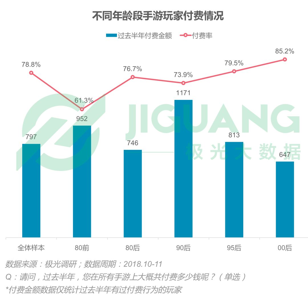 其中,95后手游付费玩家过去半年有79.5%在手游上有付费行为,而00后在游戏消费上最为“土豪”,其中有85.2%的用户有付费行为,平均付费金额为647元。