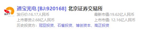 本周重点监测到国内IPO公司1家,位于北京证券交易所。为「通宝光电」,最新市值19.62亿人民币, 曾获冠亚投资、石雀投资、高正投资投资。