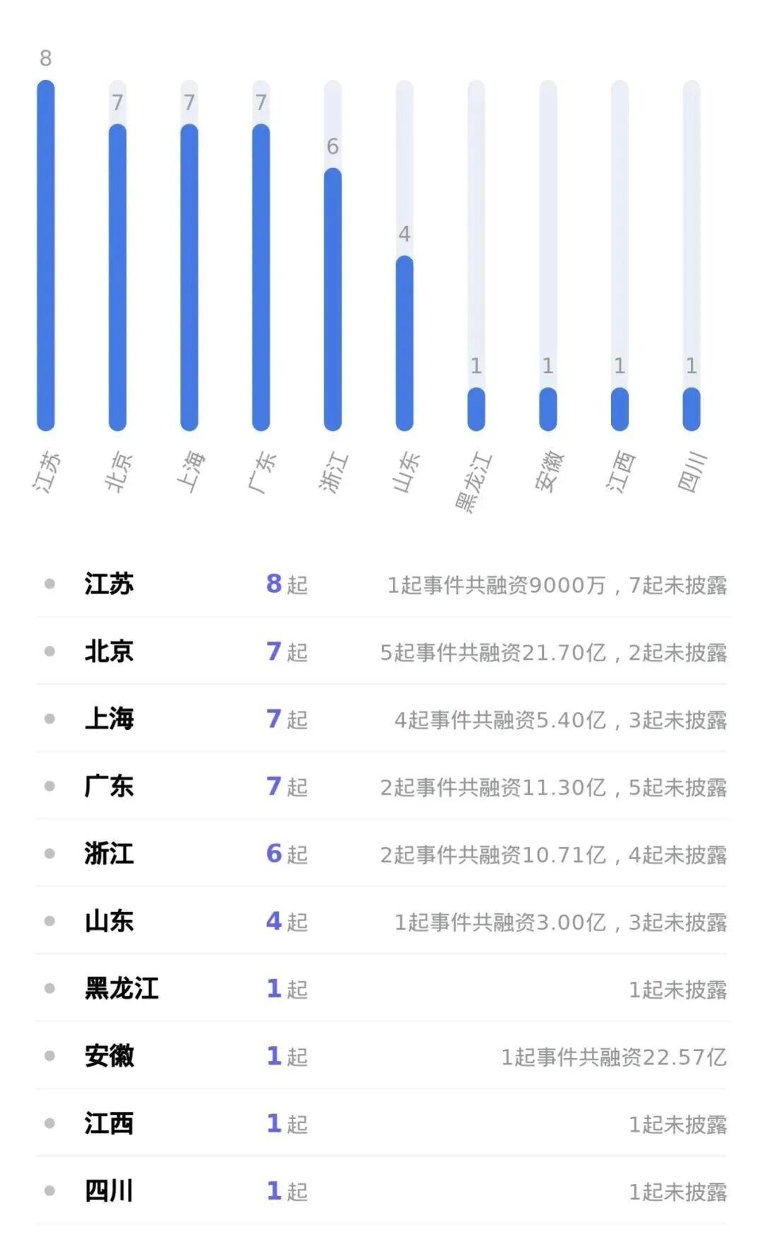 从本周披露获投企业的地区分布来看,主要集中在江苏、北京、上海。其中江苏披露8个,北京披露7个,上海披露7个。