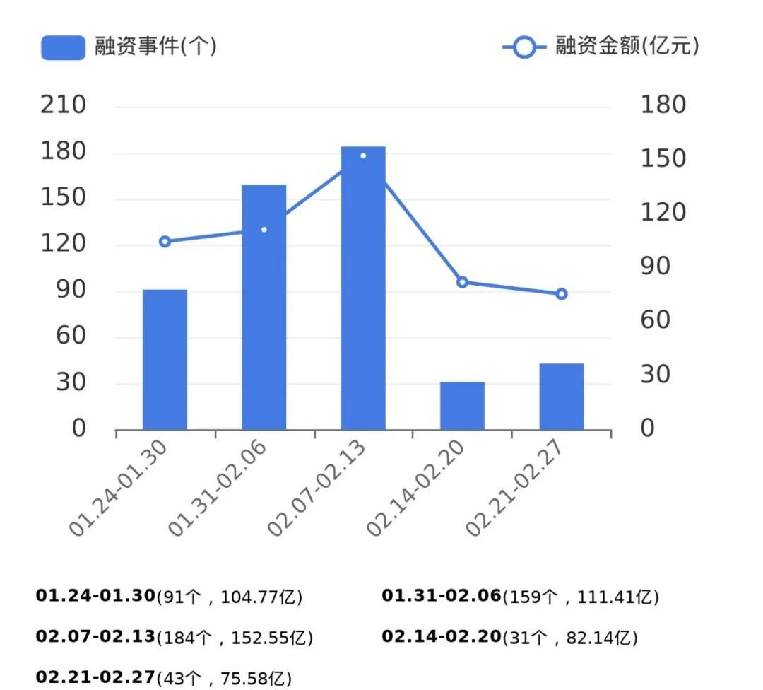 根据睿兽分析监测数据,本周国内一级市场披露的融资事件43个,与上周相比增加12个,其中已披露融资金额的事件16个,总融资规模为75.58亿元人民币,平均融资金额为4.72亿元人民币。
