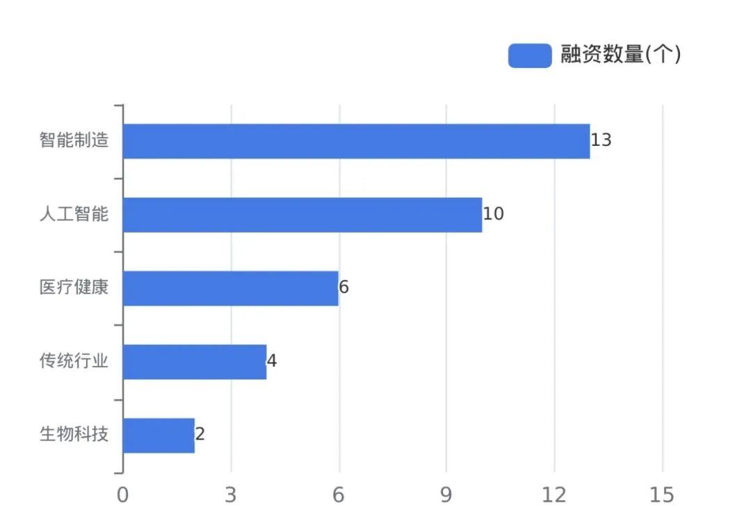 从融资事件数量来看,本周智能制造、人工智能、医疗健康领域融资最活跃。分别为智能制造13个、人工智能10个、医疗健康6个。