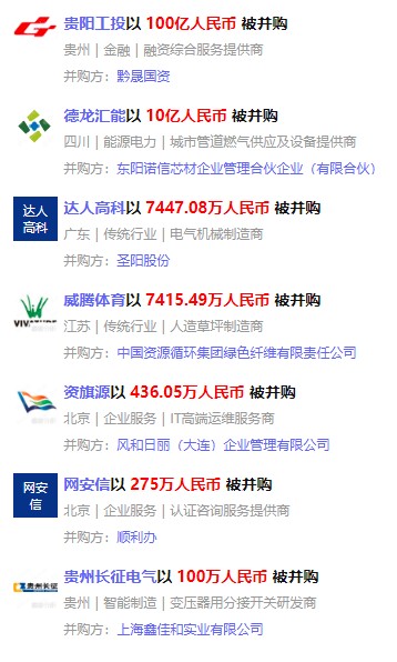 本周国内披露已完成的并购事件9个,与上周相比增加6个,分布在传统行业、能源电力、企业服务行业。其中,黔晟国资以100亿人民币收购融资综合服务提供商贵阳工投82.65%股份。被收购方贵阳工投主要承担投资产业导向、融资综合服务、工业经济结构战略性调整和国有资产战略重组推进等业务。 曾获得黔晟国资、贵阳产控集团等机构投资。
