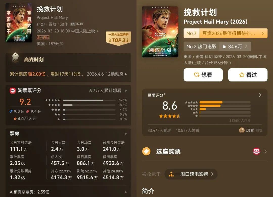 目前上映进入第三周的《挽救计划》依旧势头不减,全球票房已突破4.2亿美元,北美首周8050万,成为2026年最大开画影片。烂番茄95%,豆瓣8.6分,国内上映9天破亿,也是春节档后首部票房破亿院线电影。