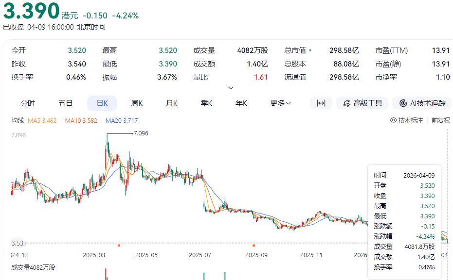 截至4月9日收盘,中国飞鹤港股报价3.39港元/股,是2025年以来新低,相较2021年高位约24.06港元/股,累计跌幅约86%,总市值更是跌破300亿,仅约298.6亿港元。