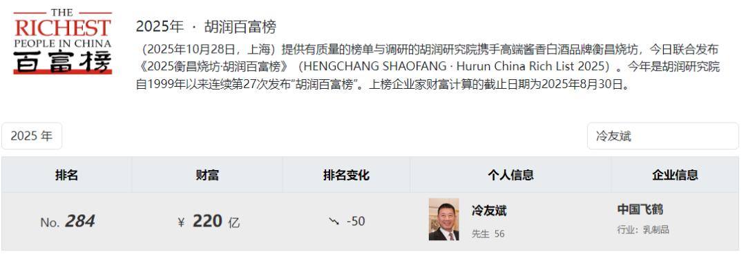 东方财富网显示,中国飞鹤董事长冷友斌持有公司49.38%的权益股份,按此计算,冷友斌可分到公司大部分分红。《2025年·胡润百富榜》显示,冷友斌个人财富220亿元,位列榜单第284位。