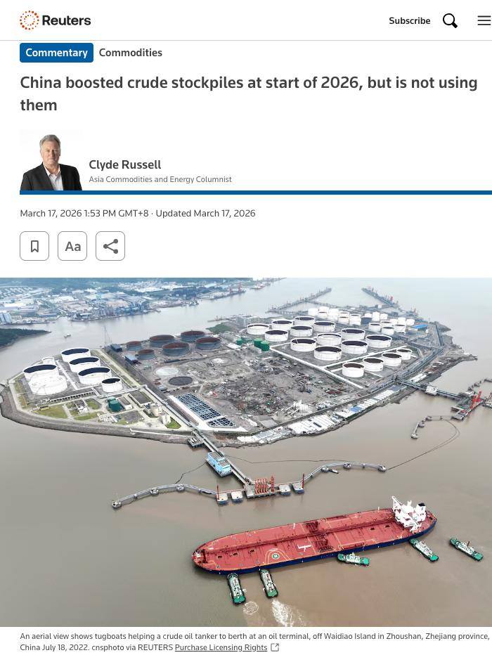 Reuters:China boosted crude stockpiles at start of 2026, but is not using them