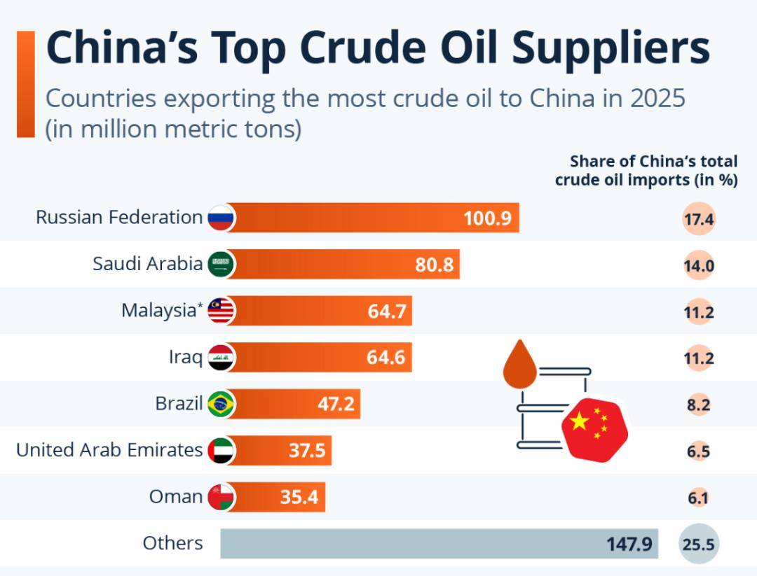 拿2025年的数据来说,占比榜一大哥俄罗斯只有17.4%,榜二沙特阿拉伯则是14%。