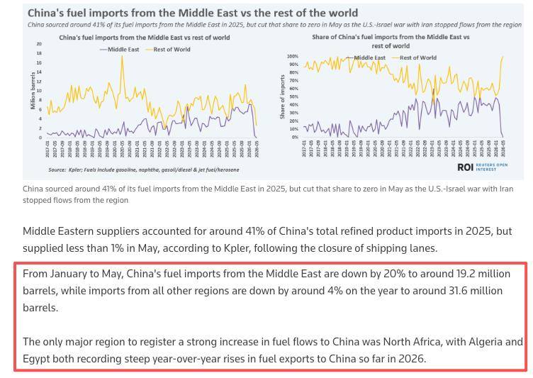 另外路透社今天的分析也说,今年1月至5月,中国从中东进口的燃料量同比下降20%,约为1920万桶;结果在北非的阿尔及利亚和埃及, 2026 年对华燃料出口却实现了大幅增长。