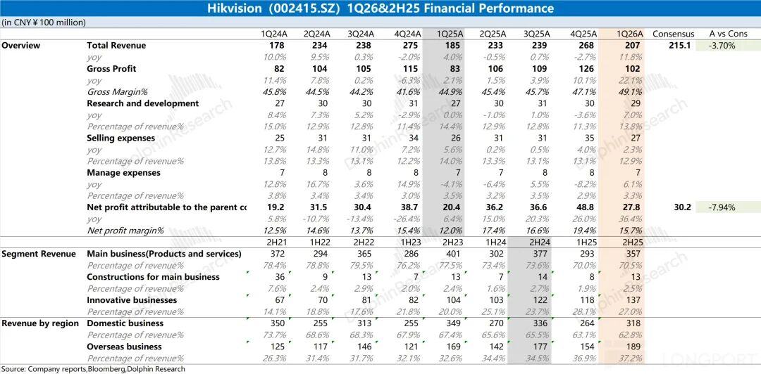 海康威视在 2026 年第一季度实现营收 207 亿元,同比上升 12%。公司营收重回两位数增长,主要是因为公司在本季度对全系产品进行了统一涨价。