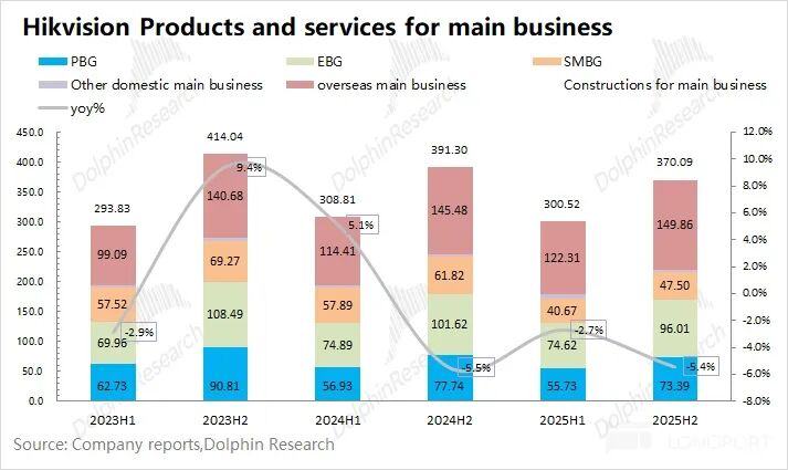 海康威视的主业产品及服务业务在 2025 年下半年实现营收 370 亿元,同比下滑 5.4%。受国内主业低迷的影响,再次陷入下滑。