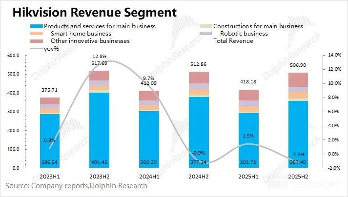 二、各业务进展情况:创新业务持续增长,国内主业仍低迷。海康威视 2025 年下半年国内三大事业群还都出现了不同幅度下滑。