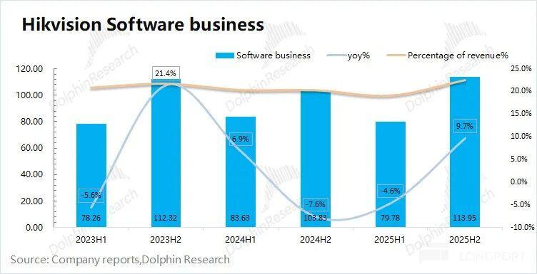 海豚君通过估算 2025 年下半年海康威视的软件端业务收入为 114 亿元,同比增长 10%。海康威视软件附加值,在公司总收入的比重回升至 22% 附近。