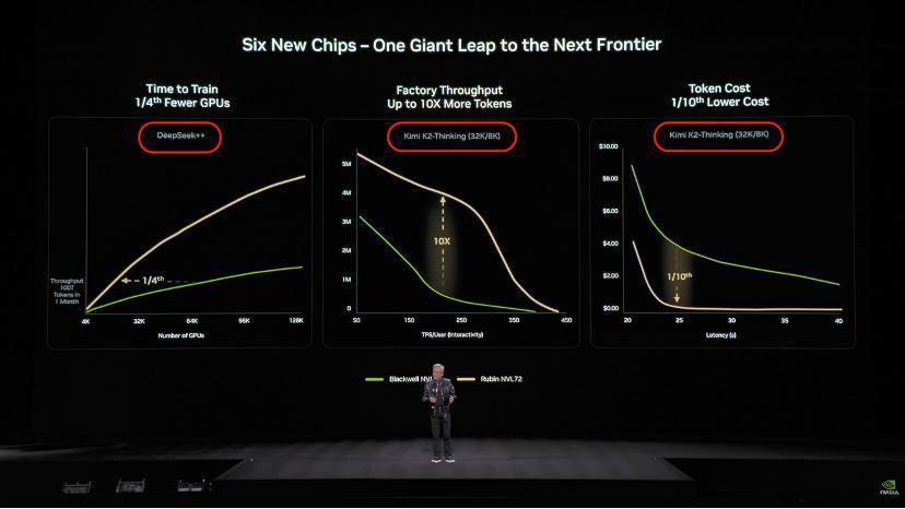 而在黄仁勋的CES主题演讲上,黄仁勋更是将 DeepSeek 和 Kimi K2-Thinking 模型赫然放上大屏幕,作为展示其下一代 Blackwell 与 Rubin 芯片强大性能的 Benchmark 标杆: