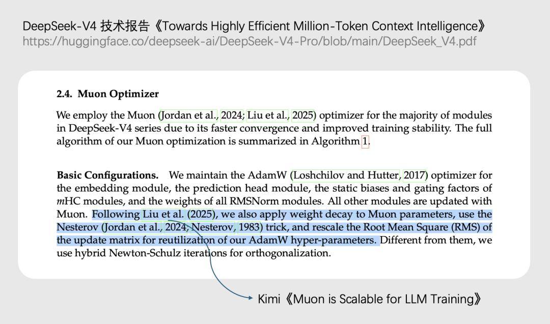 如今,DeepSeek V4 也跟进用 Muon 优化器技术,实现训练效率的稳定性。两家公司将底层的优化技术相互吸纳,打破了技术壁垒,展现出前所未有的深度合作。